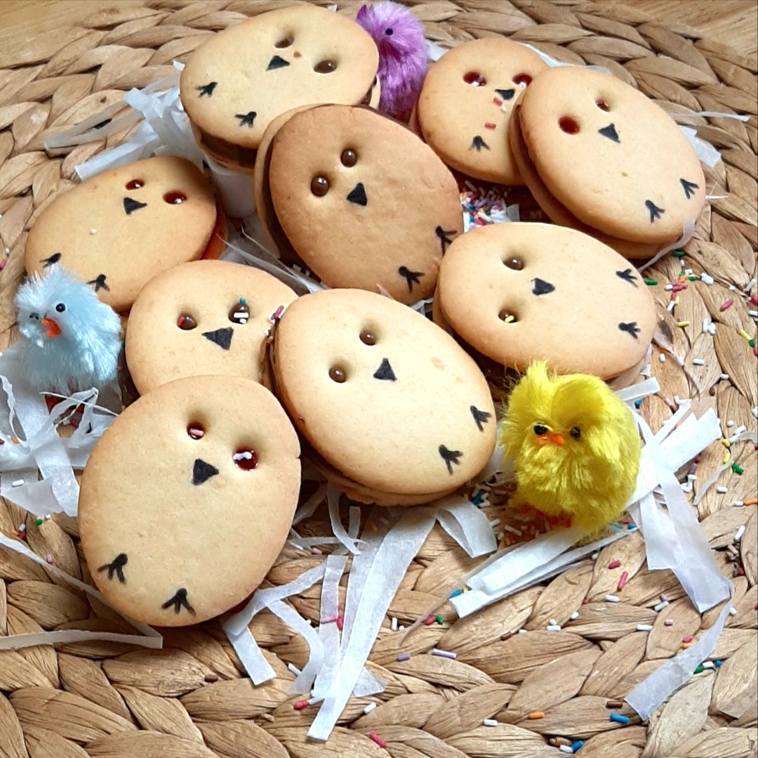 HO UTILIZZATO uno stampo di metallo rotondo (un coppapasta), un beccuccio da sacca da pasticciere per gli occhi e un pennarello edibile per i disegni. Infornati a 160° per 35 minuti.