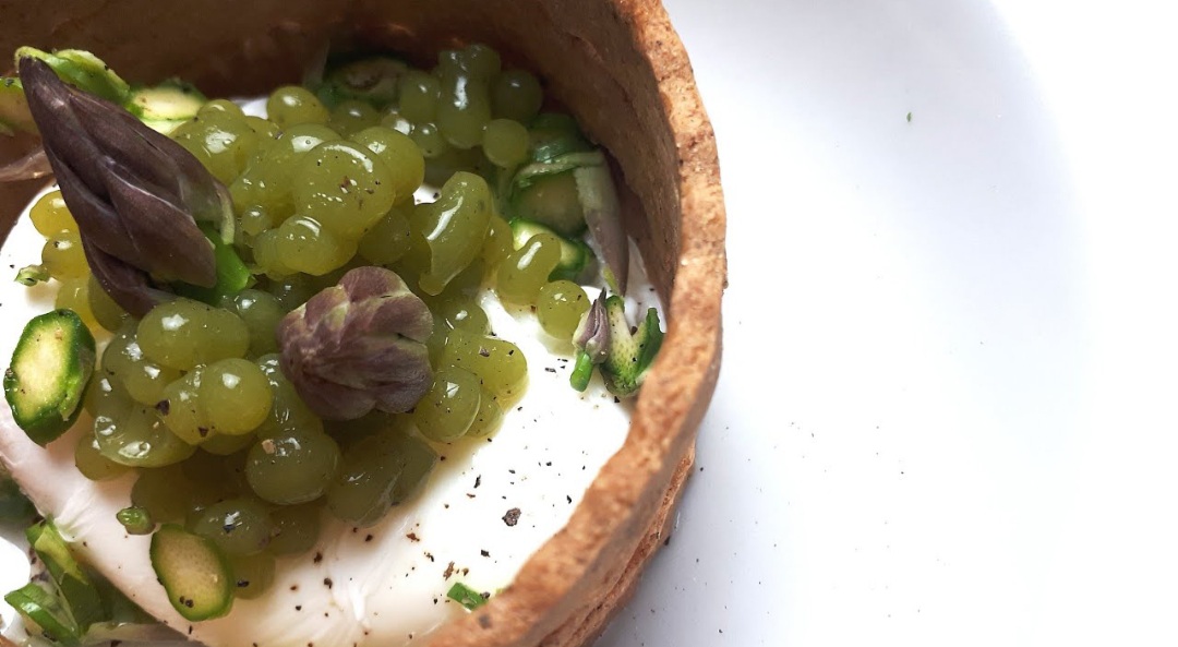 Le perline sono una facilissima sferificazione di succo di asparagi e menta, fatte con l’agar agar e l’olio freddissimo, come insegna il nostro Guido Mori, maestro di tecnica di cucina scientifica.