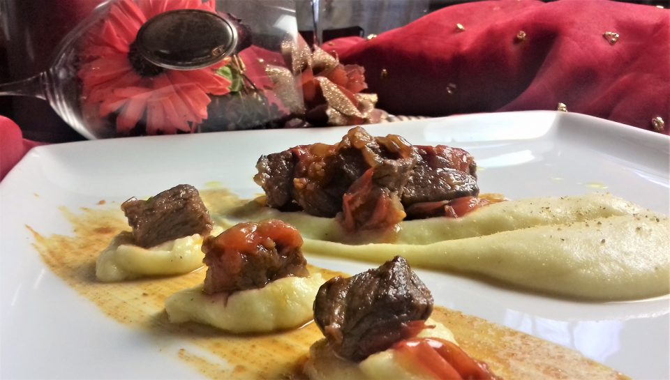Impiattate accostando ad una porzione di crema di polenta il vostro Gulash, spennellandolo con il suo sugo glassato.