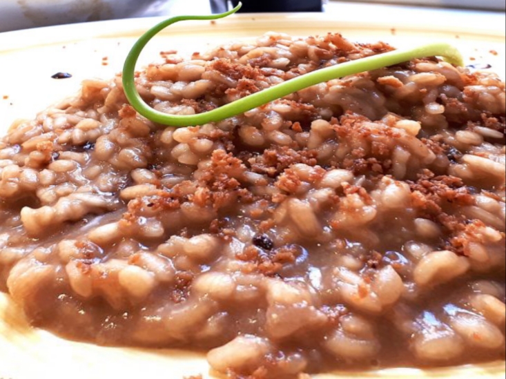 11. servite il vostro risotto ancora caldo, con una manciata di crumble di taralli in superficie e qualche goccia di aceto balsamico.