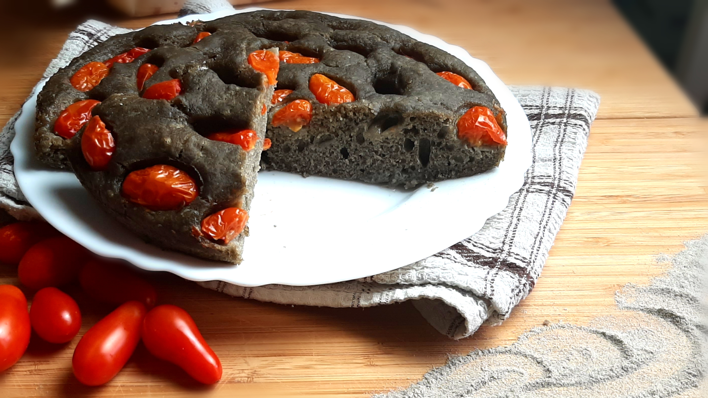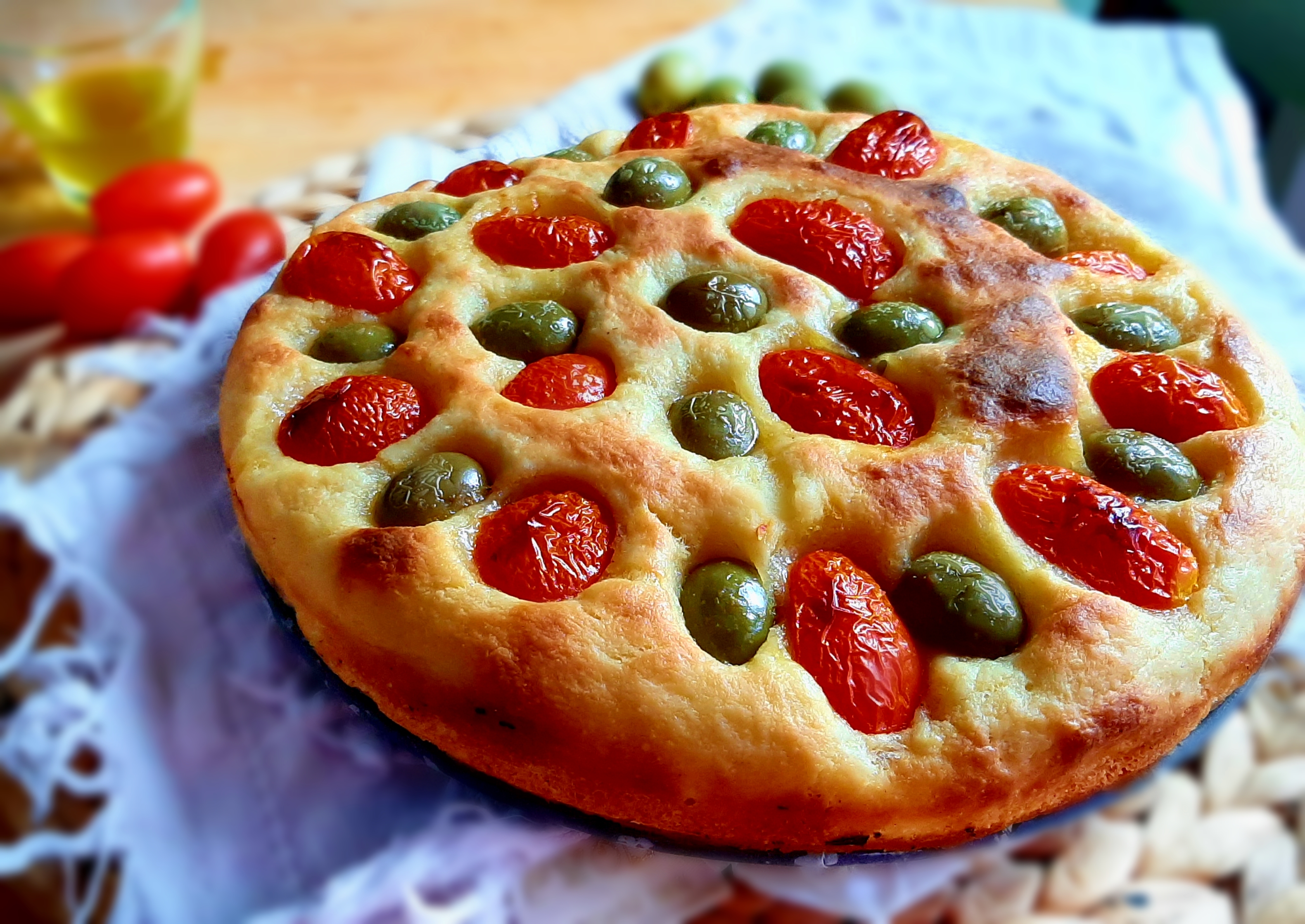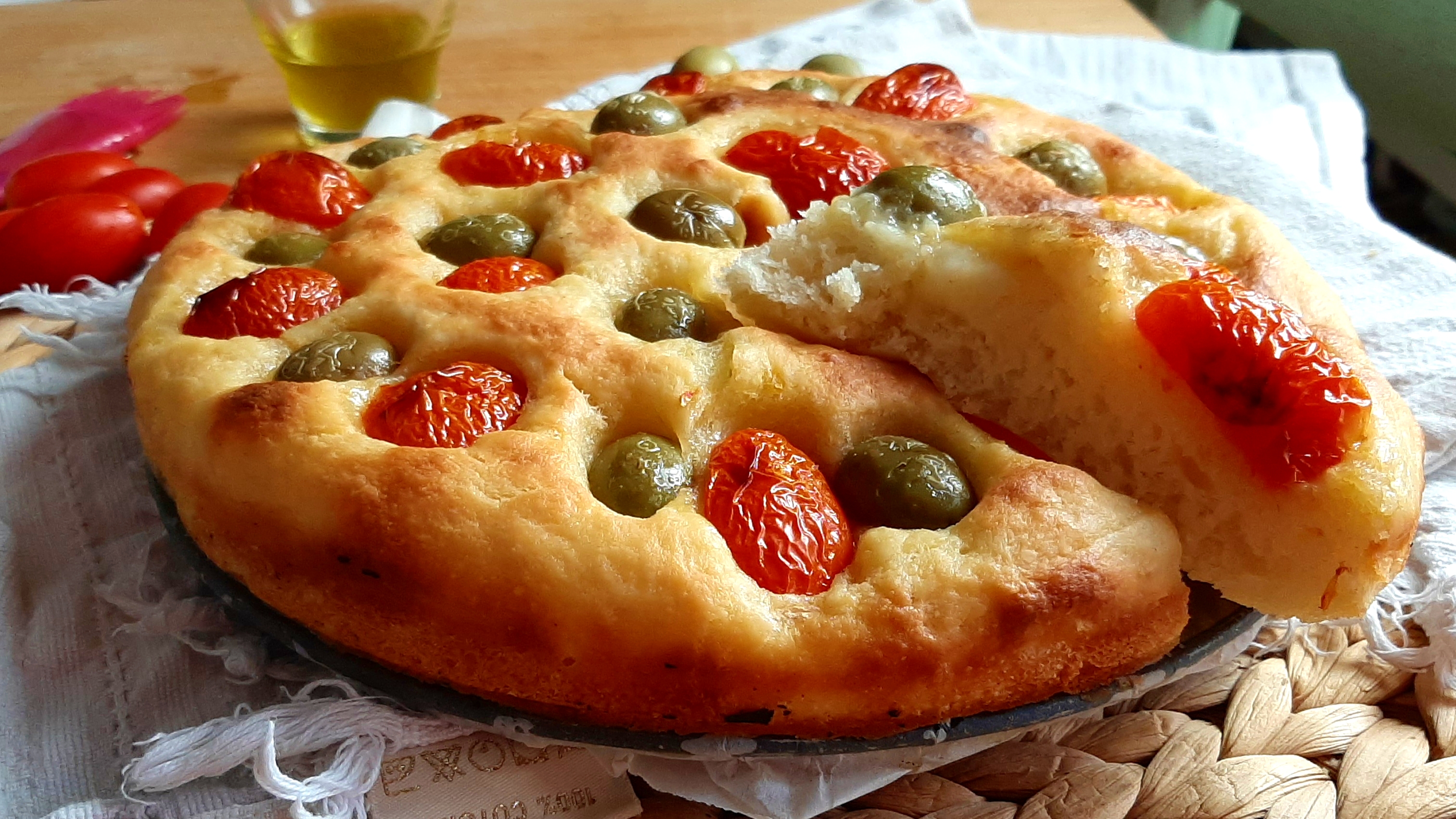 6. Al termine della lievitazione, stendete la focaccia in uno stampo a cerniera da 23cm, conditela con pomodorini tagliati a metà, olive pugliesi (non nella versione grano arso) e lasciate riposare in forno spento, con luce accesa per circa 40 minuti. Poi estraete dal forno.