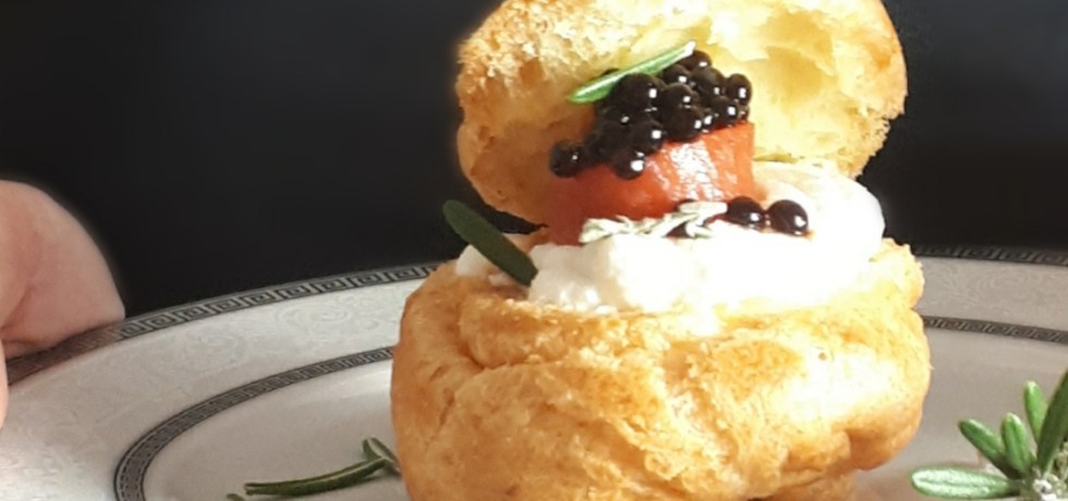 Choux di ricotta al rosmarino, salmone e caviale di teriyaki