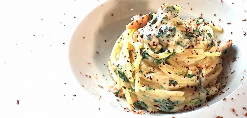 Spaghetti salmone e rucola con cioccolato